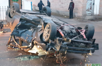 Автівка на великій швидкості в'їхала у сходи. Аварія трапилася у місті Рожище. Від удару авто перевернулося.
