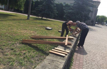У центрі Ковеля поблизу фонтану встановлюють нові лавки (парапети).