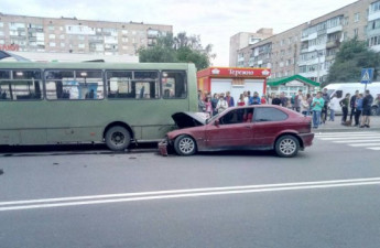 У Луцьку на вулиці Конякіна водій БМВ обминав легковик Чері Амулет, який виїхав на зустрічну смугу, та влетів у маршрутку