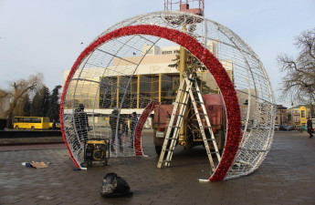 У самісінькому центрі Луцька, неподалік від головних новорічних ялинок міста, монтують святкову ілюмінацію – кулю із гірлянд