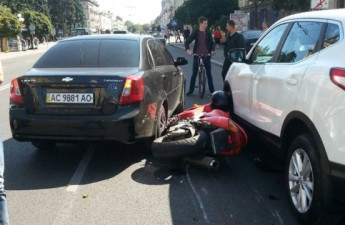 Аварія за участю мотоцикла і двох автівок сталася у центрі Луцька