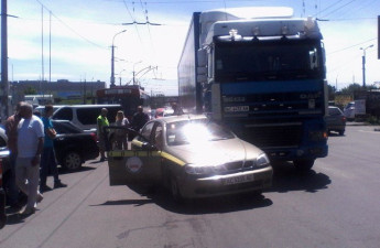 У районі Варшавського ринку біля ТЦ ЮВАНТ аварія: зіткнулись фура (TIR) та легковик Daewoo (навчальний).
