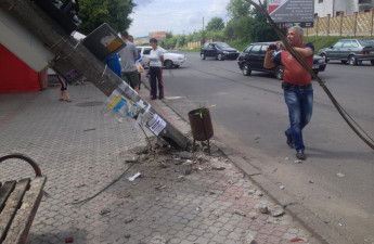Внаслідок зіткнення з зустрічним авто Fiat ледве не в'їхав у зупинку громадського транспорту з людьми, а натомість збив електроопору зі світлофором