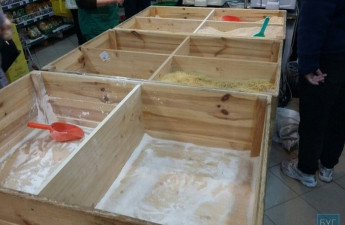 Через різкий обвал гривні, люди поспішили скуповувати продукти першої необхідності. Магазинні полиці із борошном, крупами, олією практично порожні, товари продаються в обмеженій кількості