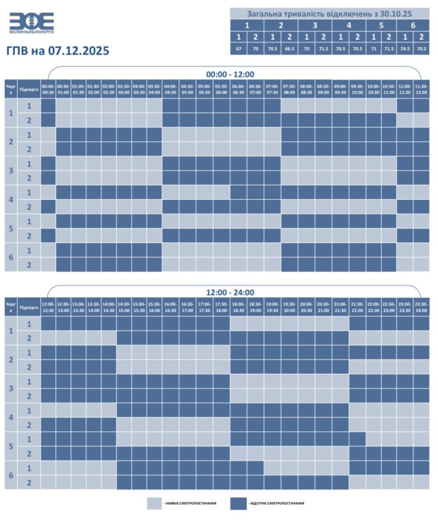 підчерга 1.2. – 00:00-00:30, 04:00-11:00, 14:30-21:30;