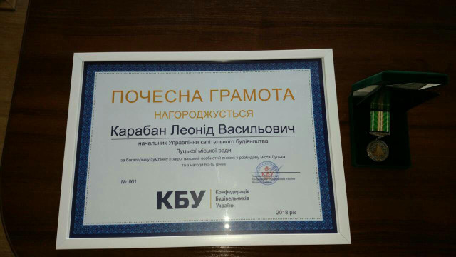 Почесною грамотою Конфедерації будівельників України та відзнакою Будівельної палати України – медаллю «Золота кельма» нагородили Леоніда Карабана.