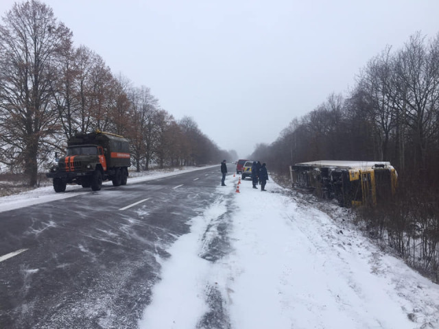 З його слів, водій вантажівки не впорався з керуванням на слизькій заметені дорозі. У результаті авто злетіло з дороги поблизу села Колодяжне і перекинулося.