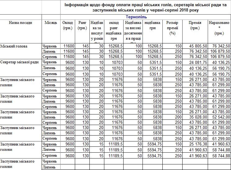Секретарю Тернопільської міської ради в червні цього року нарахували 40,137 тис. грн. Заступникам міського голови – по 43,785 тис. грн та 41,96 тис. грн. Розмір зарплати Тернопільського міського голови, як зазначалося, становить 76,343 тис. грн.