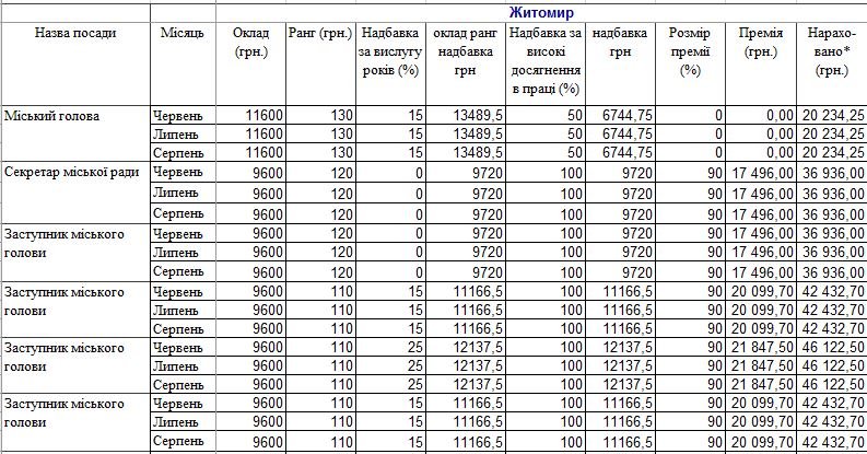 У Житомирській міські раді найвища зарплатня була не в мера, як у попередніх випадках, а у заступників міського голови та секретаря ради. Так, міському голові було нараховано 20,234 тис. грн заробітної плати. А секретарю – 36,936 тис. грн, заступникам мера – 36,936 тис. грн, 42,433 тис. грн та 46,123 тис. грн.