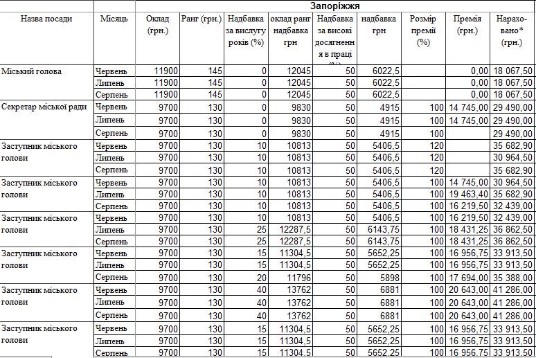 Зарплата секретаря Запорізької міської ради також була більшою за заробітну плату міського голови – 29,49 тис. грн проти 18,068 тис. грн. Заступникам мера ж нарахували 35,683 тис. грн, 30,965 тис. грн, 32,439 тис. грн, 41,286 тис. грн та 33,914 тис. грн.