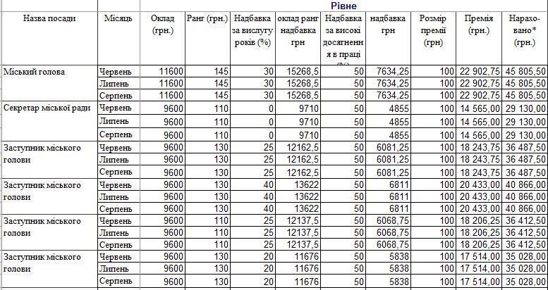 Керівнику Рівненської міської ради було нараховано 45,806 тис. грн зарплати. Секретарю ради – 29,13 тис. грн. Заступникам міського голови – 36,488 тис. грн, 40,866 тис. грн, 36,413 тис. грн та 35,028 тис. грн.
