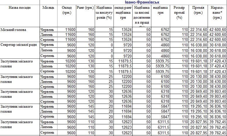 У Івано-Франківській міській раді секретар отримав 30,618 тис. грн, заступники міського голови – 37,42 тис. грн, 38,43 тис. грн, 39,803 тис. грн, 36,836 тис. грн та 39,762 тис. грн. Міському голові нарахували 42,601 тис. грн зарплати.