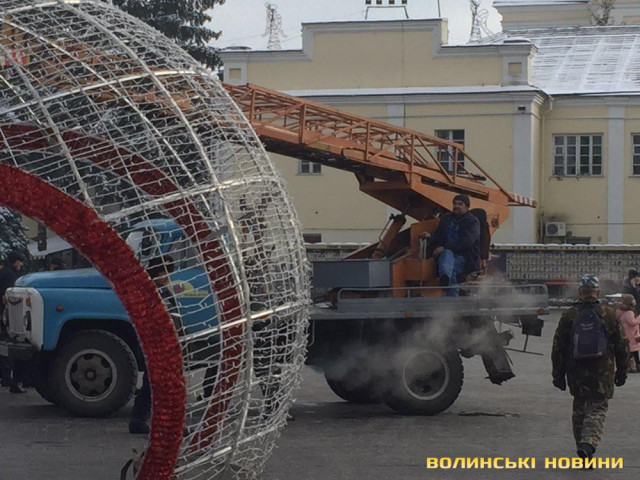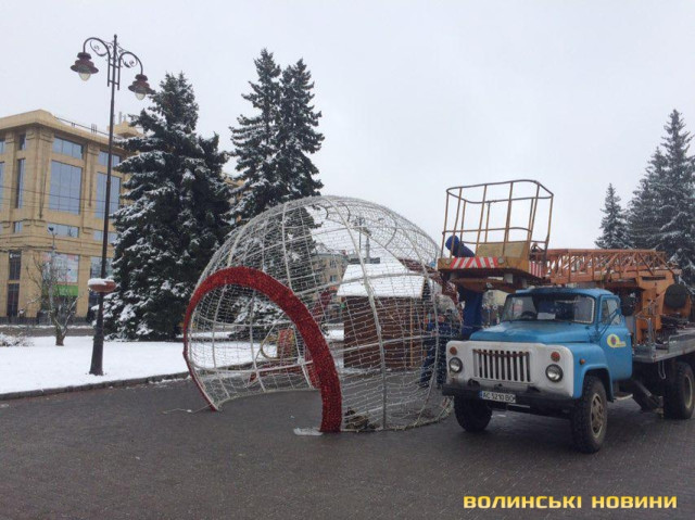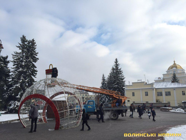 На Театральному майдані у центрі Луцька монтують новорічну інсталяцію - велику ялинкову кулю.